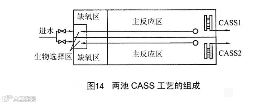 CASS 或CAST 或CASP工艺称为循环式活性污泥工艺。该工艺是在ICEAS工艺基础上, 将生物选择器与SBR反应器有机结合。通常CASS反应器分为3个区域(图14): 生物选择区、缺氧区和主反应区,各区容积之比为1:s: 30。污水首先进入选择区,与来自主反应区的污泥(20%~ 30%)混合,经过厌氧反应后进入主反应区。与ICEAS工艺相比,CASS工艺将主反应区中部分污泥回流至生物选择器中,而且沉淀阶段不进水, 使排水的稳定性得到保障。CASS工艺解决了ICEAS工艺对于SBR优点部分的弱化问题, 脱氮除磷效果比ICEAS更好。