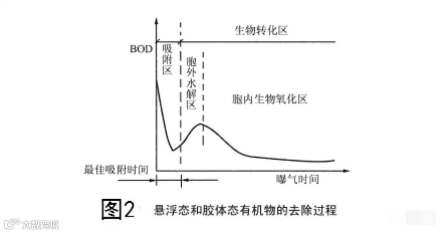 被吸附在活性污泥微生物细胞表面的有机污染物,在透膜酶的作用下,溶解态和小分子有机物直接透过细胞壁进入细胞体内,而胶体态和悬浮态的大分子有机物如淀粉、蛋白质等则先在细胞外酶一水解酶的作用 下,被水解为溶解态小分子后再进入细胞体内,此时水解产生的部分溶解性简单有机物会扩散到混合液中,造成混合液BOD值升高,如图2中胞外水解区曲线所示。