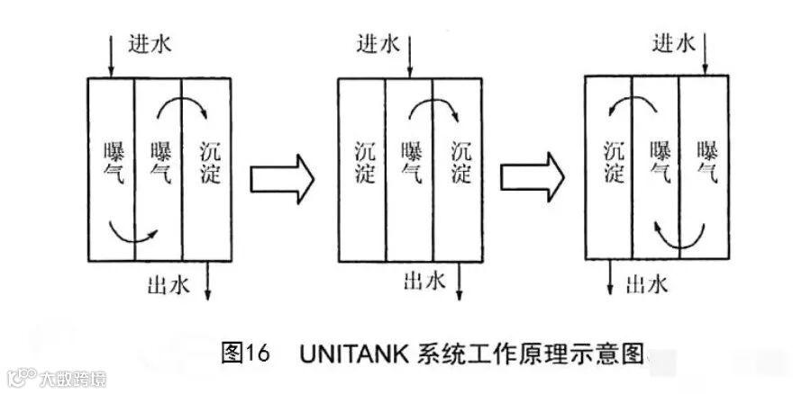 UNITANK系统是一体化活性污泥法工艺,类似于三沟式氧化沟工艺,为连续进水连续出水的处理工艺。UNITANK系统在外形上是一矩形体,里面被分割成3个相等的以开孔公共墙相隔的矩形单元池,中间单元池始终做曝气池,边池交替做曝气池和沉淀池(图16)。