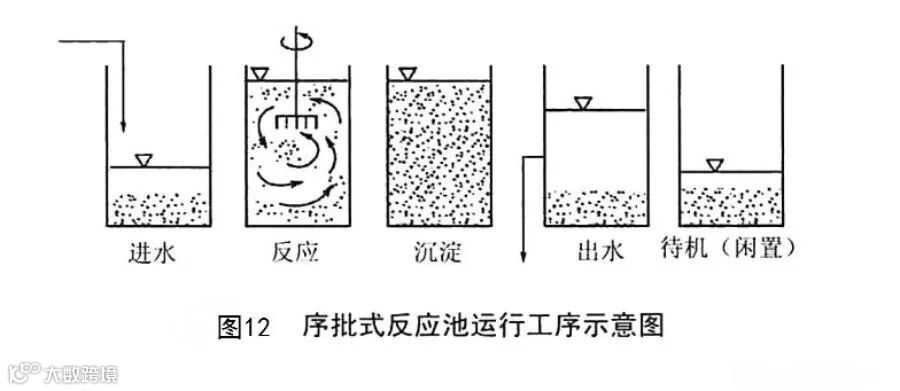 SBR工艺的运行工序如图12所示,在进水阶段,污水被加入反应器,直到预定高度(一股可允许反应器中的液位达到总容积的75%~ 100%), 当使用两个反应器时,进水时间可能占总循环时间的50%。