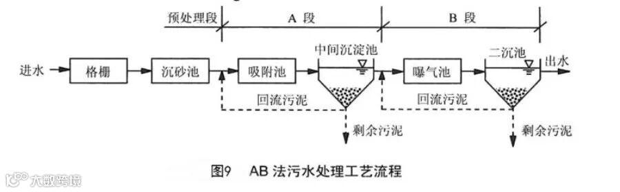 吸附-生物降解工艺简称AB法或AB工艺,其工艺流程如图9所示,整个系统由预处理段、A段、B段三个部分组成,预处理段只设格栅、沉砂池等简易处理设施,不设初沉池; A段和B段是两个串联的活性污泥系统,A段为吸附段,由吸附池和中间沉淀池组成,主要用于污染物的吸附去除,其污泥负荷达2.0~6.0 kg (BOD5) /[kg(MLSS)·d], 为传统法的10~20倍,泥龄短(0.3~0.5d),水力停留时间短(约30min)。