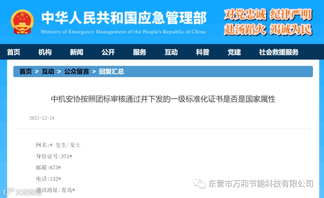 7、咨询:目前,我们兄弟公司寰宇东方国际集装箱启东有限公司,由中国机械工业安全卫生协会审核通过,审核依据团标《机械制造企业安全生产标准化考核评级规范TCMISHA1002-2019》,下发的证书红章落款也是中国机械工业安全卫生协会,请问这是传统意义上的一级标准化证书吗即证书的属性是否是《企业安全生产标准化建设定级办法》应急【2021】83号规定的证书。咨询时间: 2021-12-19