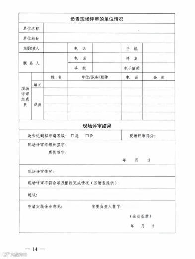 (三)评审。定级部门对组织单位报送的审核意见和企业自评报告进行确认后,由组织单位通知负责现场评审的单位成立现场评审组在 20 个工作日内完成现场评审,将现场评审情况及不符合项等形成现场评审报告(格式见附件2),初步确定企业是否达到拟申请的等级,并书面告知企业。