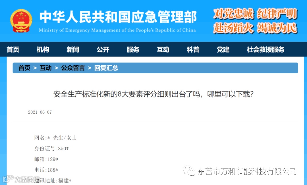18、咨询:2021年5月咨询的问题,没收到回复啊?想咨询现在安全生产标准化8个要素的评分细则出台了吗,在哪里可以下载?企业现在申请安全生产标准化参照哪个细则?另外企业安全生产标准化2018年就到期了,但期间未进行复评审。那么今年企业重新申报的话,是要按初次申请申报,还是复评申请申报?咨询时间: 2021-06-01