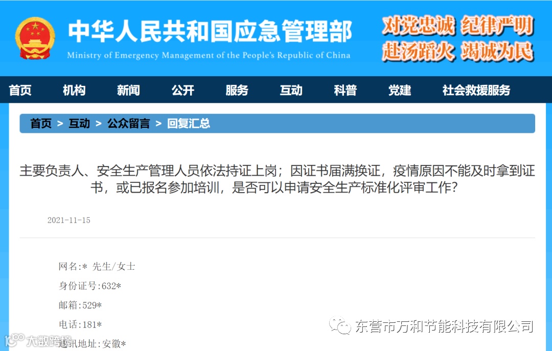 15、咨询:第八条 申请定级的企业应当在自评报告中,由其主要负责人承诺符合以下条件:一依法应当具备的证照齐全有效;二依法设置安全生产管理机构或者配备安全生产管理人员;三主要负责人、安全生产管理人员、特种作业人员依法持证上岗;问题:其中三主要负责人、安全生产管理人员依法持证上岗;因证书届满换证,疫情原因不能及时拿到证书,或已报名参加培训,是否可以申请安全生产标准化评审工作?咨询时间: 2021-11-08