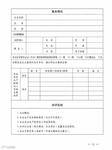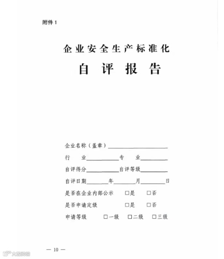 (一)自评。企业应当自主开展标准化建设,成立由其主要负责人任组长、有员工代表参加的工作组,按照生产流程和风险情况,对照所属行业标准化定级标准,将本企业标准和规范融入安全生产管理体系,做到全员参与,实现安全管理系统化、岗位操作行为规范化、设备设施本质安全化、作业环境器具定置化。每年至少开展一次自评工作,并形成书面自评报告,在企业内部公示不少于10个工作日,及时整改发现的问题,持续改进安全绩效。