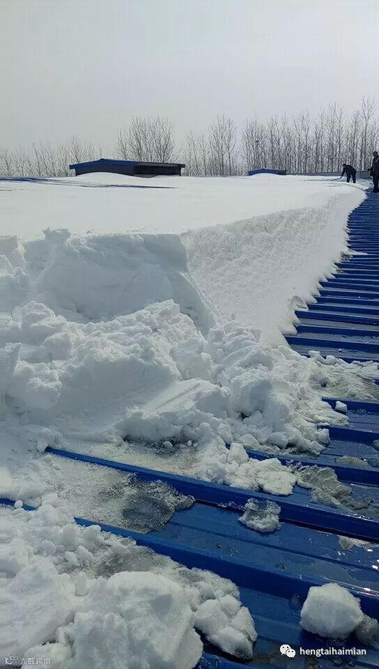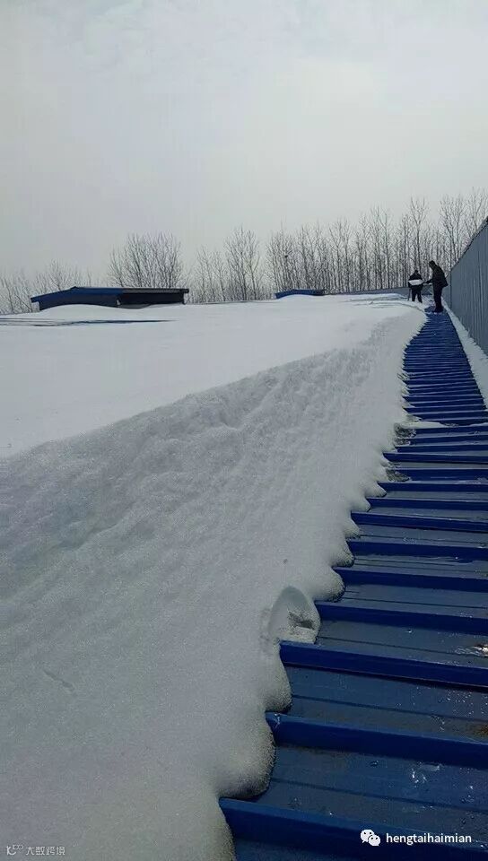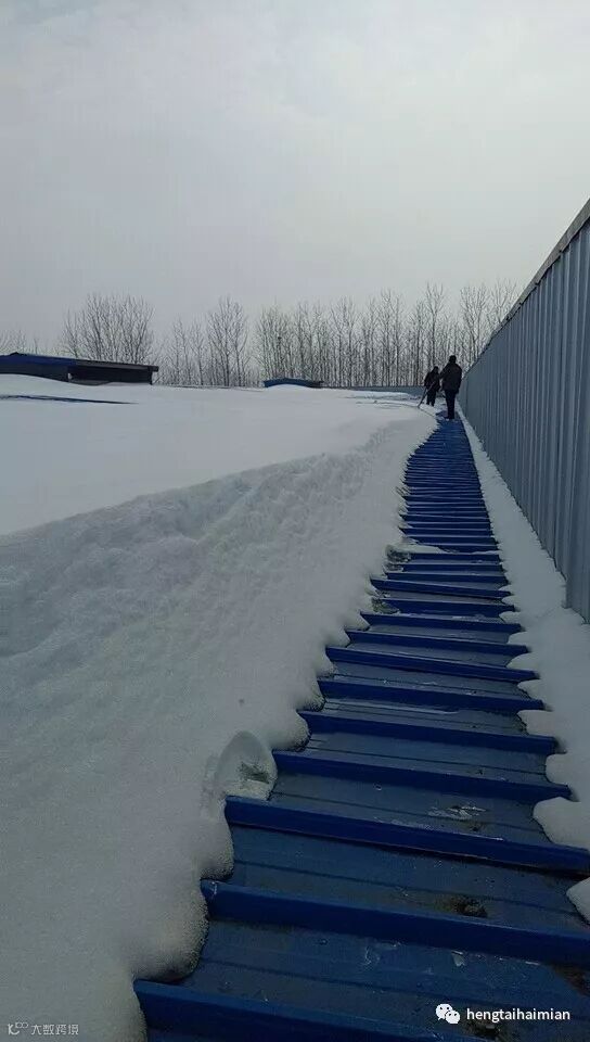 工作人员冒着危险到厂房顶上扫除积雪。注意安全你们辛苦了!!!