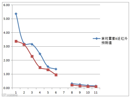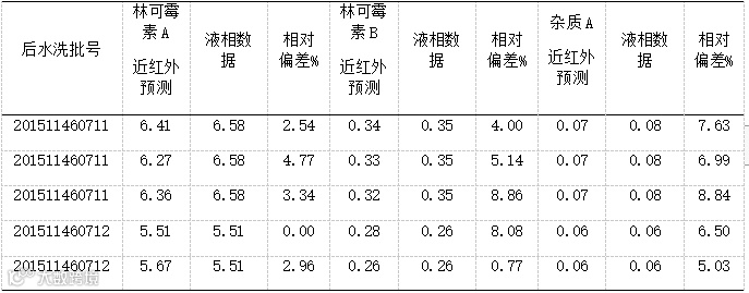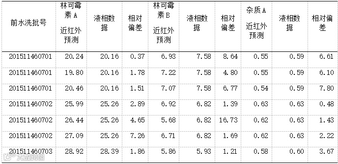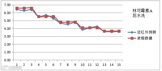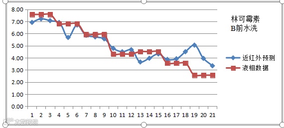 根据建模样本化验值,上表中林可霉素B黄色值已超出模型范围,我们认为目前建立的模型为一个实验模型,离在生产线的实际应用还需要做一些工作。主要是考察批次间差异,并使模型包含这种差异,适应正常的批次变化。