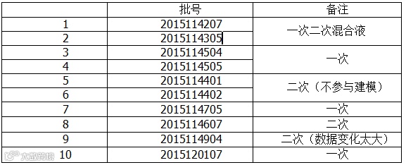 通过对化验值分析可以发现,每批次成分含量变化较大,而且上柱脱色液的投料分为3种,即一次脱色、二次及一次二次混合,为保证模型的适用性及准确性,三种投料方式应加大取样批次,以覆盖实际生产变化。
