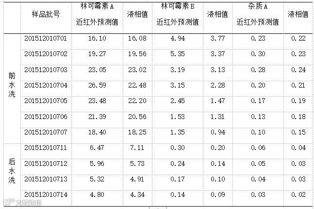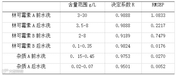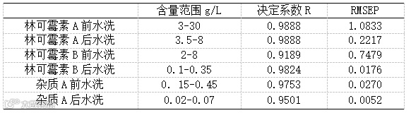 利用样品光谱数据和化验数据,通过交互验证和偏最小二乘法建立起林可霉素A、林可霉素B、杂质A的数学模型。