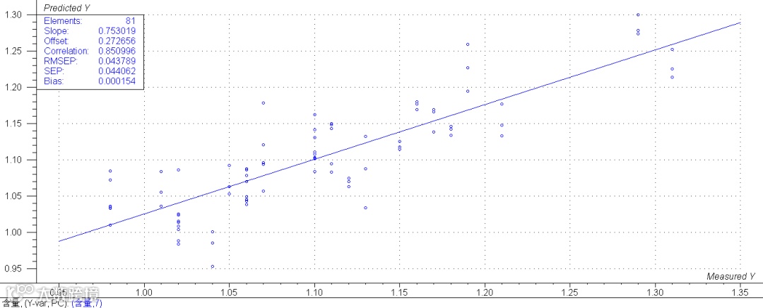 4、建模方法:光谱数据进行一阶微分九点平滑处理,将光谱与实验数据一一对应,使用PLS算法建立定量模型。