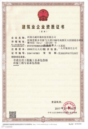 河南小威环境科技有限公司取得的市政公用工程和环保工程资质,为我公司增强行业竞争力奠定了基础,使我公司在基础设施业务承揽中拥有广泛的空间,也为开拓市场提供了有力的保障。今后,我公司将以此为契机,继续保持奋斗进取的工作面貌,戮力一心共建美好小威,为公司未来腾飞打下坚实的基础。