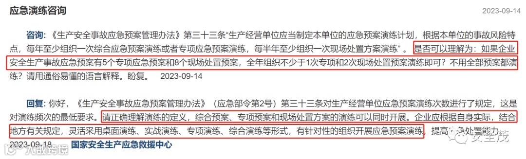 回复:你好,《生产安全事故应急预案管理办法》(应急部令第2号)第三十三条对生产经营单位应急预案演练次数进行了规定,这是对演练频次的最低要求。请正确理解演练的定义,综合预案、专项预案和现场处置方案的演练可以同时开展。企业应根据自身实际,结合地方有关规定,灵活采用桌面演练、实战演练、专项演练、综合演练等形式,有针对性的组织开展应急预案演练,提高应急处置能力。回复单位: 国家安全生产应急救援中心 回复时间: 2023-09-18
