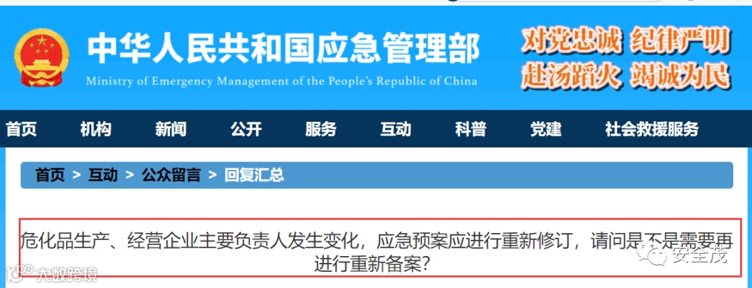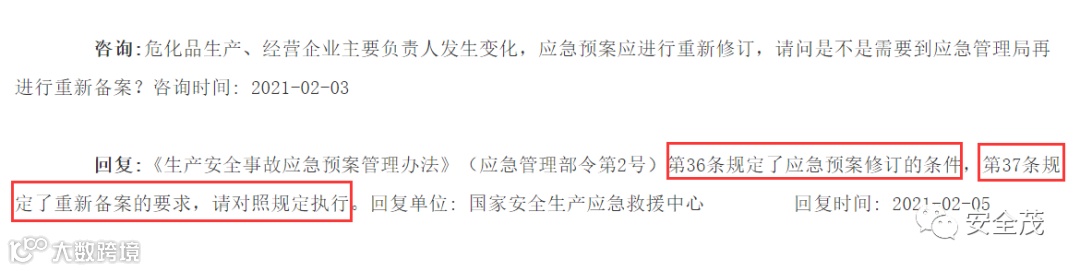 回复:《生产安全事故应急预案管理办法》(应急管理部令第2号)第36条规定了应急预案修订的条件,第37条规定了重新备案的要求,请对照规定执行。回复单位: 国家安全生产应急救援中心。回复时间: 2021-02-05