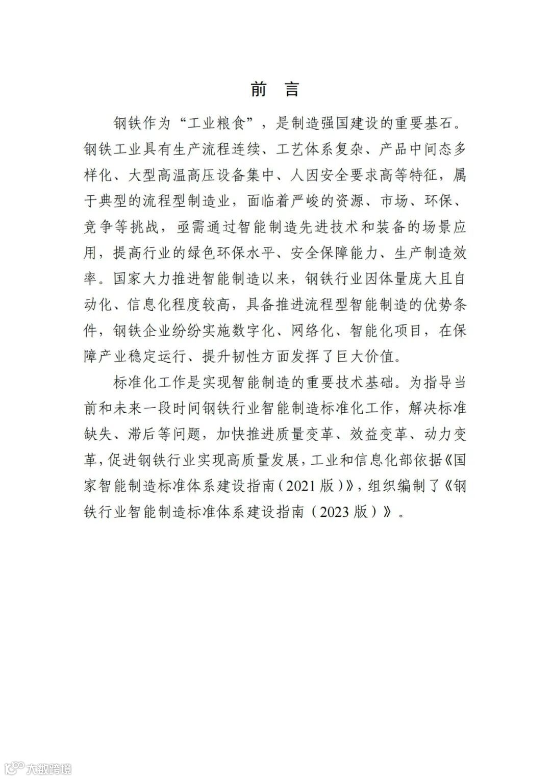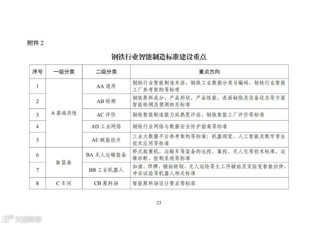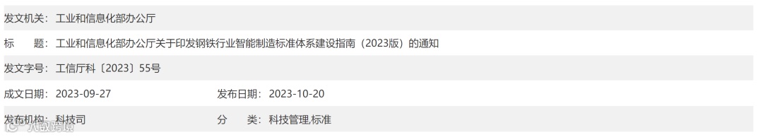 为切实发挥标准对推动钢铁行业智能制造发展的支撑和引领作用,工业和信息化部依据《国家智能制造标准体系建设指南(2021版)》《“十四五”智能制造发展规划》《“十四五”原材料工业发展规划》等,组织编制了《钢铁行业智能制造标准体系建设指南(2023版)》。现印发给你们,请结合本地区、本行业、本领域实际,在标准化工作中贯彻执行。