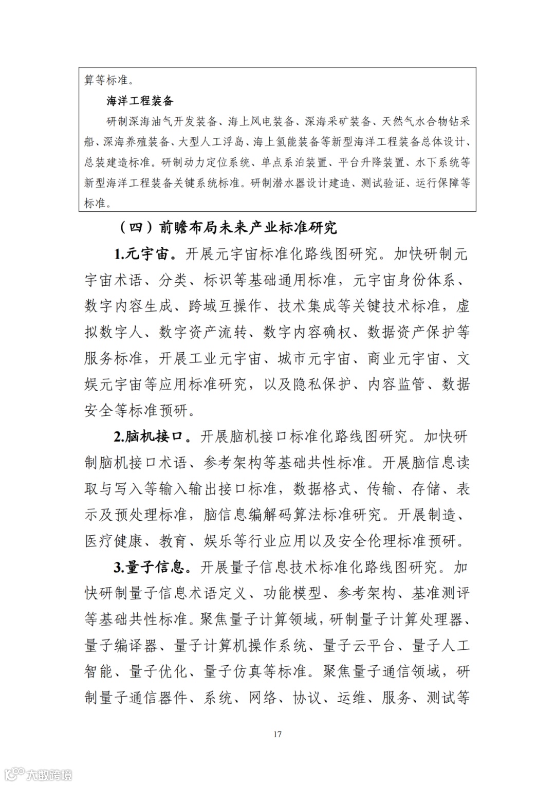 为贯彻落实《国家标准化发展纲要》,持续完善新兴产业标准体系建设,前瞻布局未来产业标准研究,充分发挥标准的行业指导作用,引领新产业高质量发展,工业和信息化部、科技部、国家能源局、国家标准化管理委员会组织编制了《新产业标准化领航工程实施方案(2023─2035年)》。现印发你们,请结合本地区、本行业实际,抓好贯彻落实。