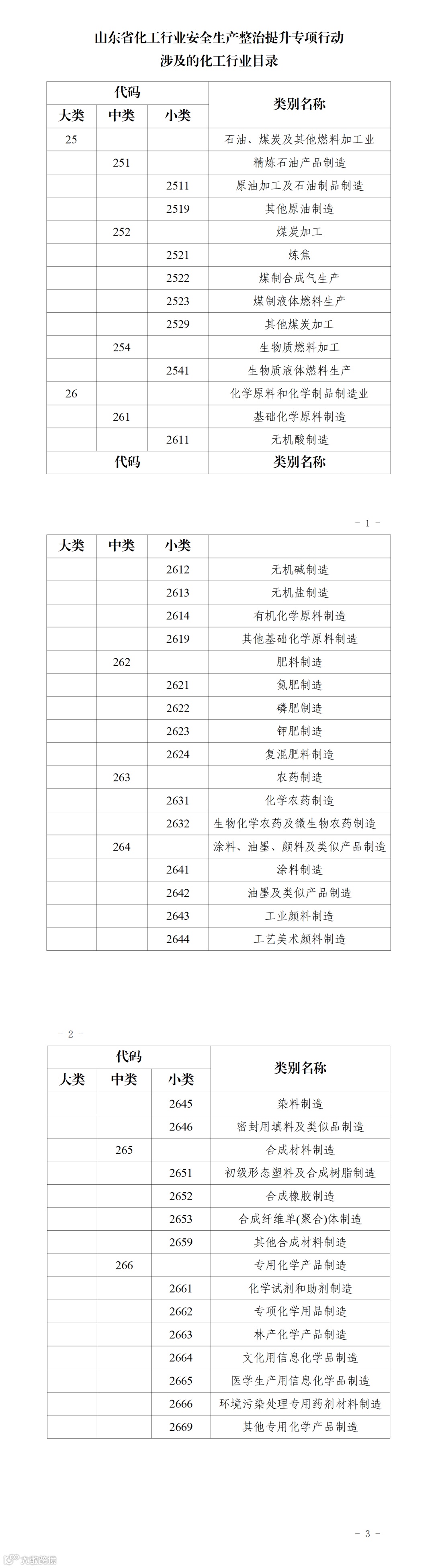 省化工行业安全生产整治提升专项行动工作专班依据国家、省有关规定和《国民经济行业分类》(GB/T4754-2017),结合我省实际,研究确定了《山东省化工行业安全生产整治提升专项行动涉及的化工行业目录》。现印发给你们,请认真贯彻执行。