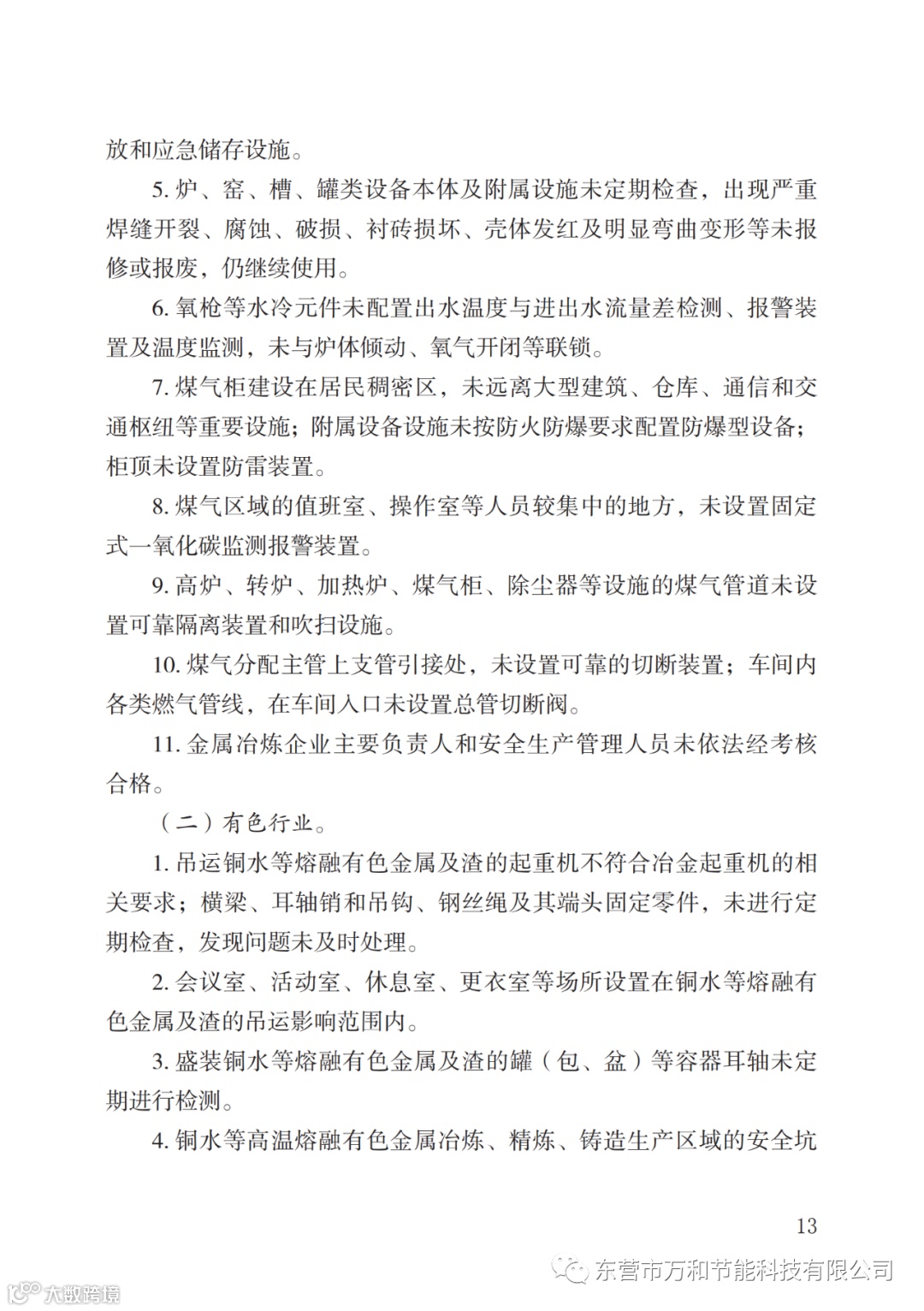 (6)高温工作的熔融有色金属冶炼炉窑、铸造机、加热炉及水冷元件未设置应急冷却水源等冷却应急处置措施。