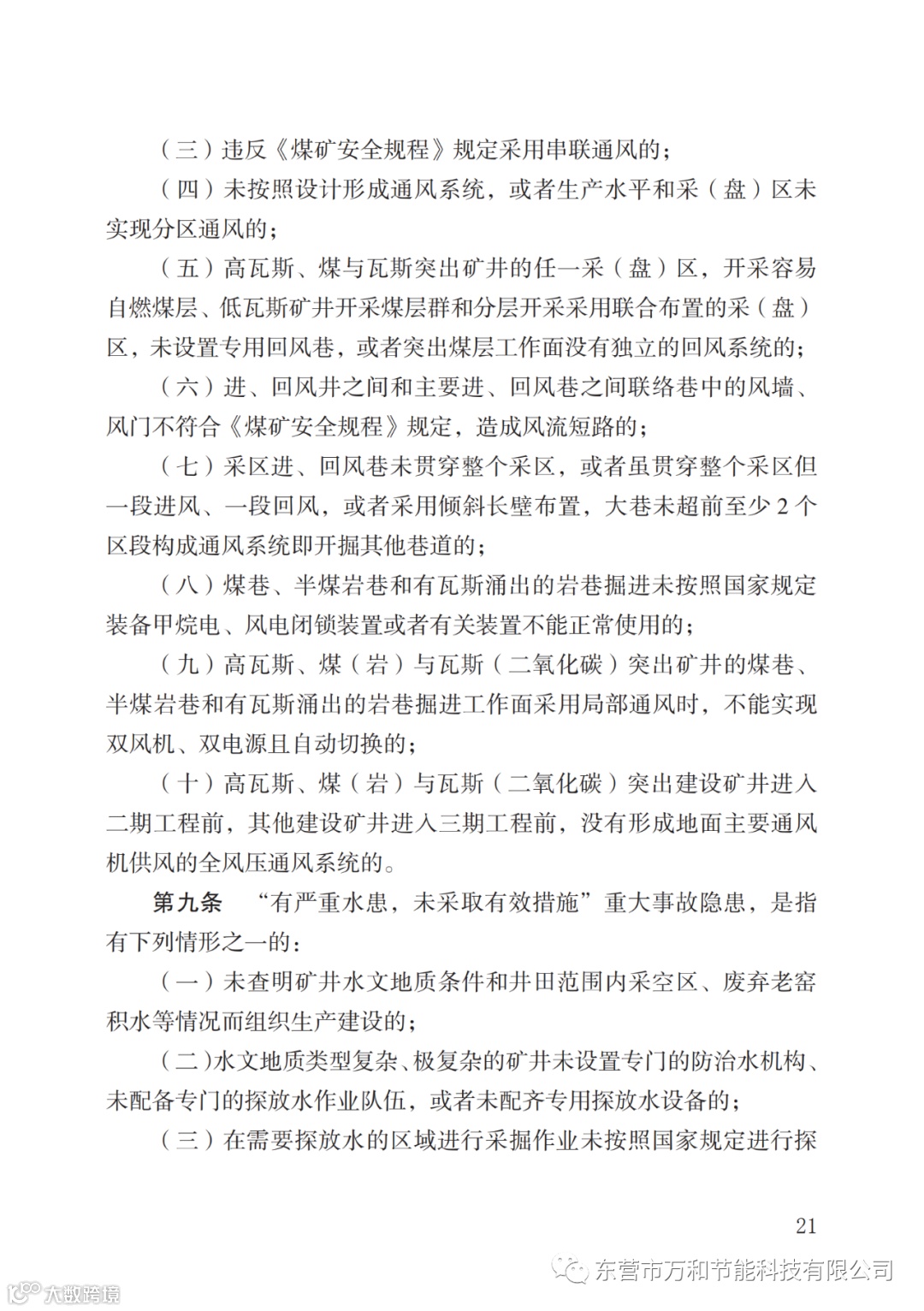 9.水文地质类型为中等及复杂的矿井没有设立专门防治水机构、配备探放水作业队伍或配齐专用探放水设备。