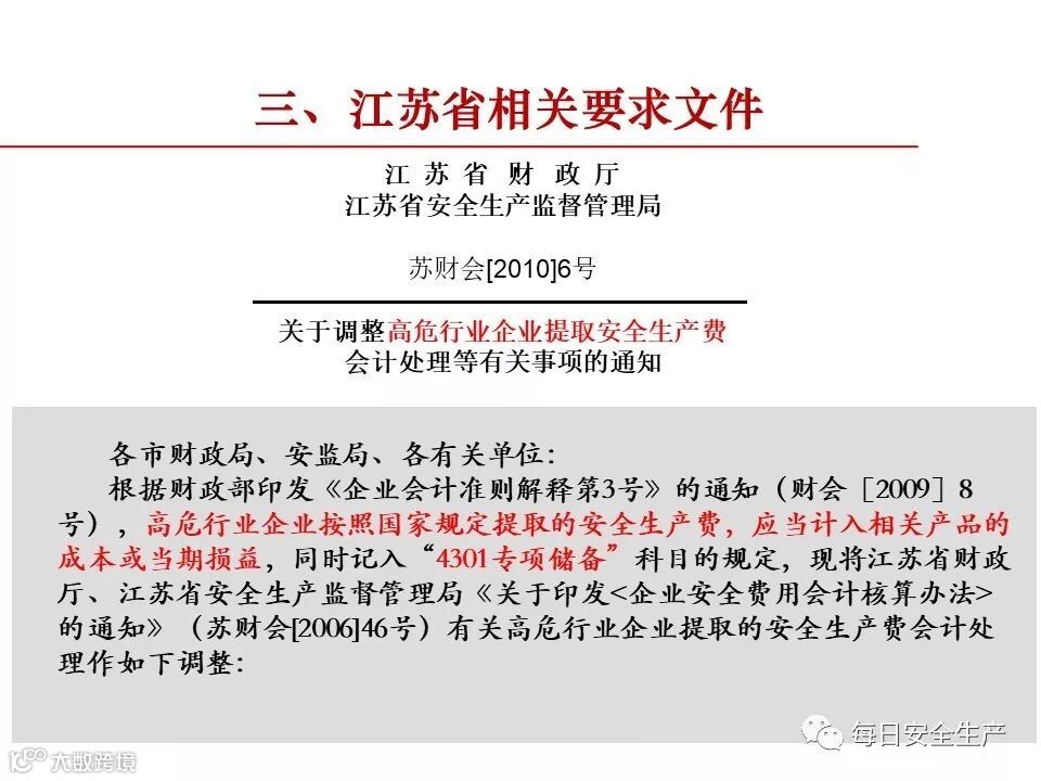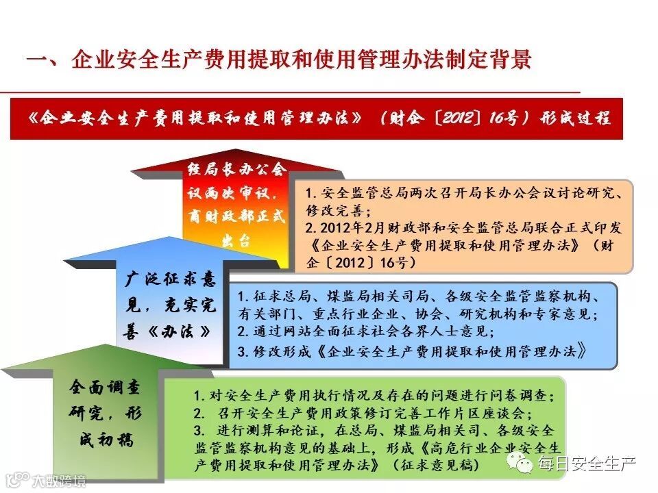 结合2012年发布实施的财政部 安全监管总局关于印发《企业安全生产费用提取和使用管理办法》的通知(财企〔 2012〕16 号)、以及2019年7月8日,应急管理部办公厅关于征求《企业安全费用提取和使用管理办法(征求意见稿)》意见的函( 应急厅函〔2019〕428号)。