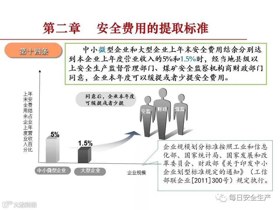 咨询:财企[2012]16号 财政部 国家安全生产监督管理总局关于印发《企业安全生产费用提取和使用管理办法》的通知,“第十四条 中小微型企业和大型企业上年末安全费用结余分别达到本企业上年度营业收入的5%和1.5%时,经当地县级以上安全生产监督管理部...
