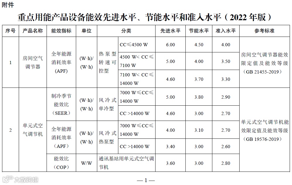 附件:重点用能产品设备能效先进水平、节能水平和准入水平(2022年版)