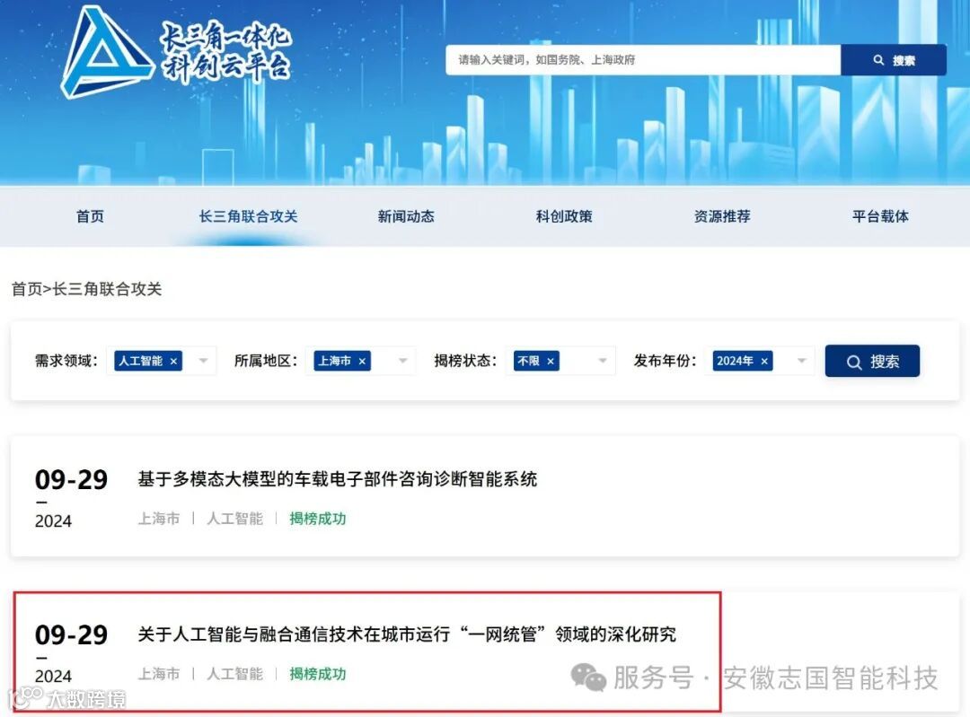 近期,长三角科技创新共同体联合攻关重点揭榜任务清单正式公布,安徽志国智能科技有限公司联合长三角区域高校及企业(上海交通大学、上海第二工业大学、联通(上海)产业互联网有限公司、上海恒驰信息系统有限公司)优势科研力量提交的课题《关于人工智能与融合通信技术在城市运行“一网统管”领域的深化研究》已成功揭榜并立项,是上海市三个成功立项项目之一。