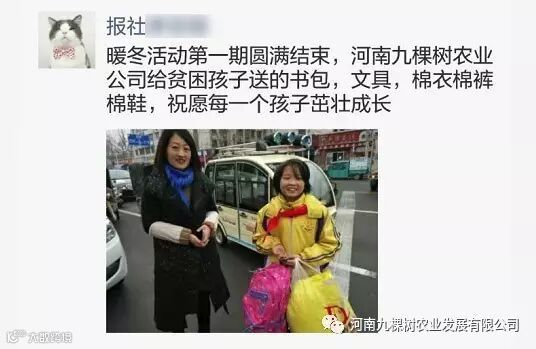 九棵树是一家致力于传承发扬香椿文化的香椿全产业链企业,在关注自身、努力成长的同时,我们也非常关注企业的社会责任,积极投身公益活动,参与社会的扶贫济困。本次给刘晓瑜、孙亚茜送来九棵树的温暖,看到她们开心的笑脸,我们深感欣慰。愿两位小朋友健康成长、学习进步。九棵树会不改初心,脚踏实地,将爱心之路继续走下去。