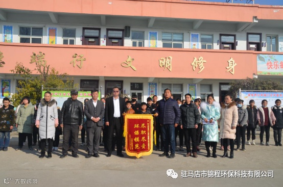 近日,古城乡吴桂桥小学的校长、教职工及学生代表在操场把一面印有“尽职尽责 环保模范”的锦旗赠给了驻马店市锦程环保科技有限公司项目部经理的手上。感谢他们为创造校园内外整洁、优美的环境,助力文明创建作出的贡献。