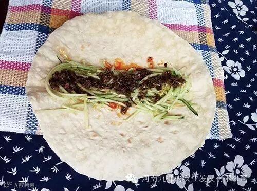 将饼展开刷一层辣椒油,放入黄瓜丝