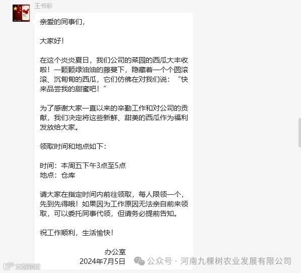 。每位员工,都将获得一个由门卫大叔亲手培育的大西瓜。这一举措,不仅仅是对大家辛勤工作的物质奖励,更是一种温情的传递,象征着公司对每一位成员价值的认可与感激。