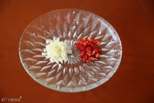 1.辣椒切圈,大蒜切碎,备用。