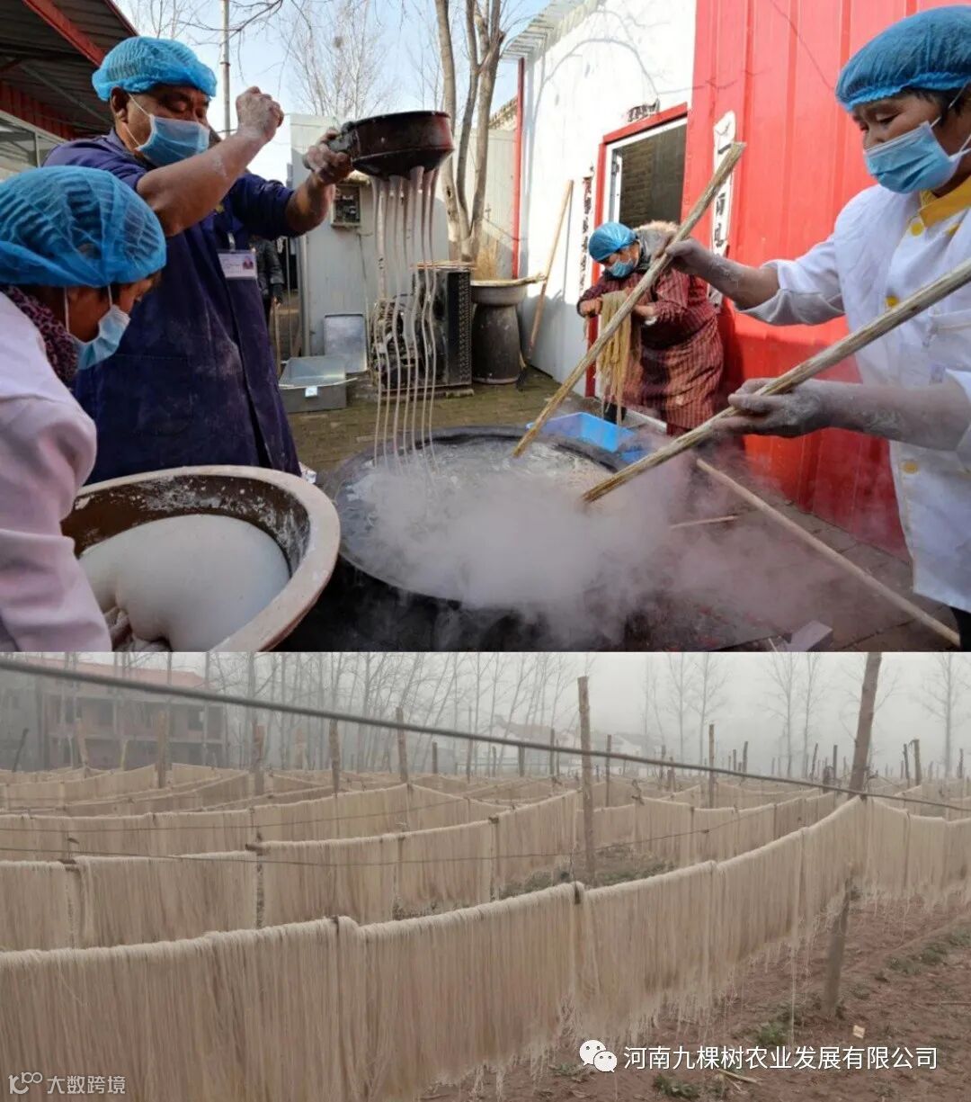 最后将粉条放置在长竹竿上,并把湿粉条一根一根的分开后才在阳光下晒制(这样粉条可更快晒干),太阳大的情况下晒3-5天即可全干,就可以收粉条装袋了。