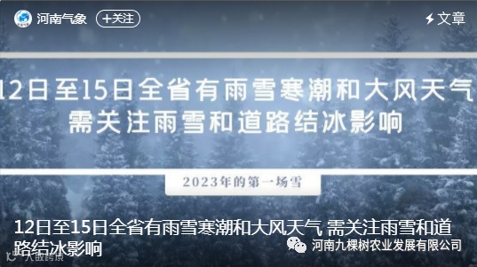 河南气象微博报道,“今天白天,我省东部、南部等地部分县市出现小雨,最大降水量为永城8.7毫米,并且京广线及其以东部分县市出现大雾天气。据最新气象资料监测分析,预计12日至15日,受西南暖湿气流和冷空气南下共同影响,我省大部将有一次雨雪、寒潮及大风天气过程。”果不其然,今天上午,迎来了河南地区2023年的第一场雪,雪花如鹅毛般,随着风的吹动,漫天飞舞,仙气十足,这场景好多年没有见到了,内心十分激动。