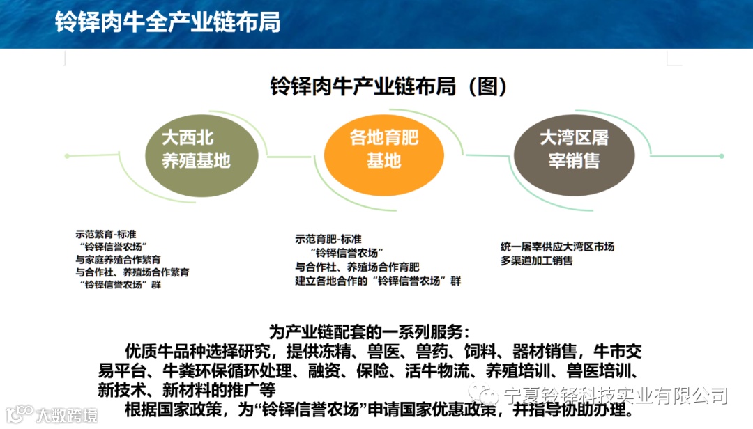 铃铎关注中国政府的农业发展政策与方向,把握高科技多元化技术应用与创新的发展,打造优质优品的杂交改良肉牛为主的服务平台,带动一大批“铃铎信誉农场”的建设,保证大湾区安全肉牛的供应,建立每头牛可追溯的数据平台,建立养殖肉牛高科技技术应用与创新的交易服务平台,形成肉牛养殖业的标准化、规模化、专业化、服务化,一条龙的产业化服务及交易平台。