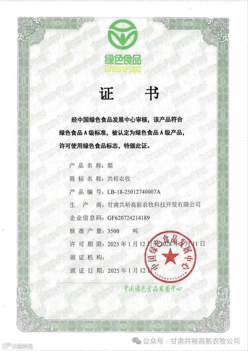 🍐甘肃张掖高台县共裕生态庄园直供👊祁连山青香蜜梨一款地标产品,产自北纬38度温带水果优势产区🔥🔥全程有机肥种植,绿色食品认证👊祁连山融化的雪水灌溉;农场牛羊粪有机肥施肥,不打药💊,不打蜡,不浸泡膨大剂;纯天然绿色健康