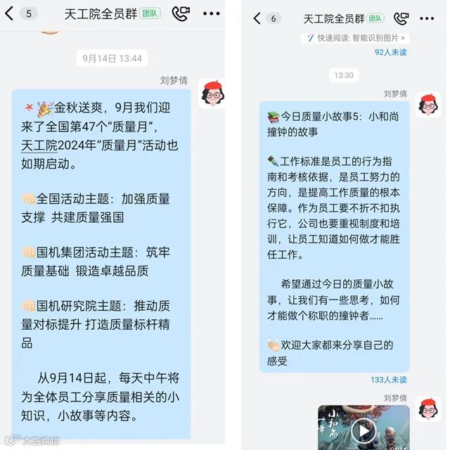 利用钉钉、微信等平台的工作群,发布活动主题、方案、工作计划等内容,让广大职工深刻认识到活动的意义。以制造中心整合专班、三标体系内部审查等工作为抓手,与天工院实际工作有机衔接,确保产品质量稳定。同时,每天利用午休时间分享 “质量小故事”,全体员工一起学习质量相关的知识,让大家感受到日常工作与质量工作的密不可分。