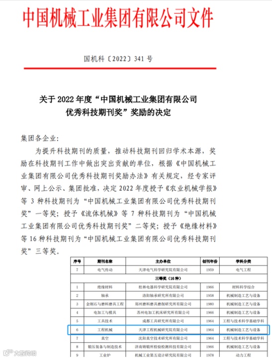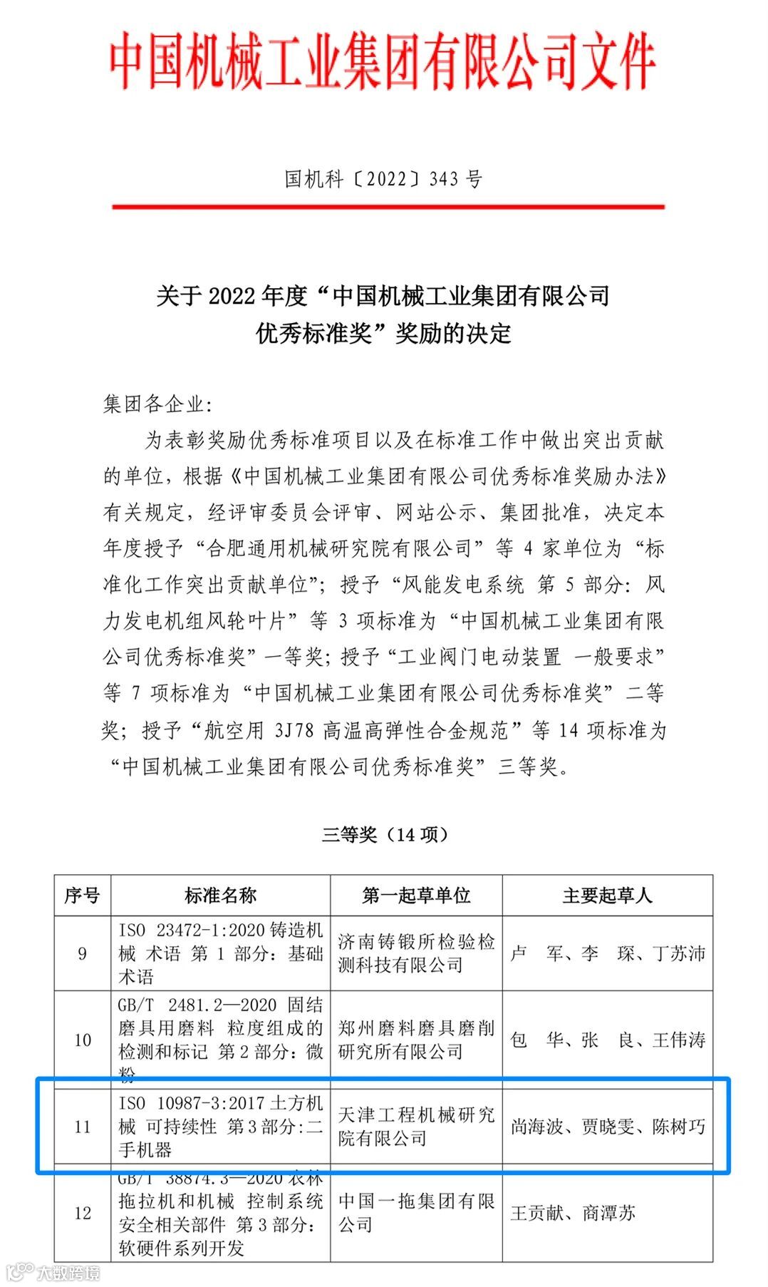 近日,国机集团发布了2022年度中国机械工业集团有限公司优秀标准奖、优秀科技期刊奖奖励的决定,我院再获两项殊荣:由我院牵头制定的国际标准《ISO 10987-3:2017 土方机械 可持续性 第3部分:二手机器》获得2022年度“中国机械工业集团有限公司优秀标准奖”三等奖;由我院主办的《工程机械》杂志获得2022“中国机械工业集团有限公司优秀科技期刊奖”三等奖。