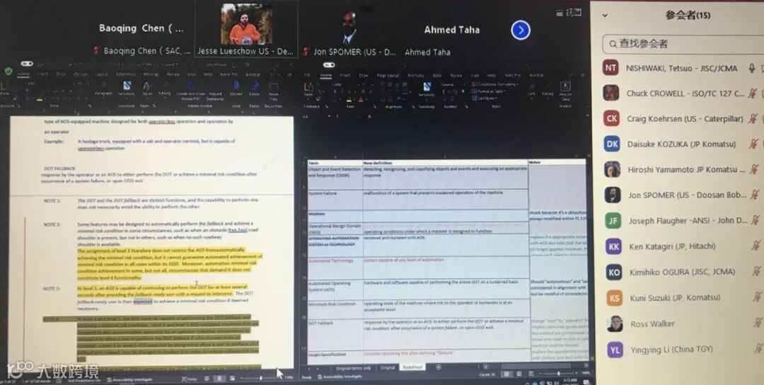 本次系列会议由约翰迪尔公司的Jesse Lueschow先生主持,主要讨论了ISO 7334 Taxonomy and Definitions for Terms Related to Operating Automation Systems for Off-Road Machines(与非公路机器的操作自动化系统相关的术语的分类和定义)工作组草案中的术语和定义,就自动化操作系统(AOS)、自动化操作系统-专用机(AOS-DM)、调度灵活性以及常规机器等术语的定义进行了针对性讨论。