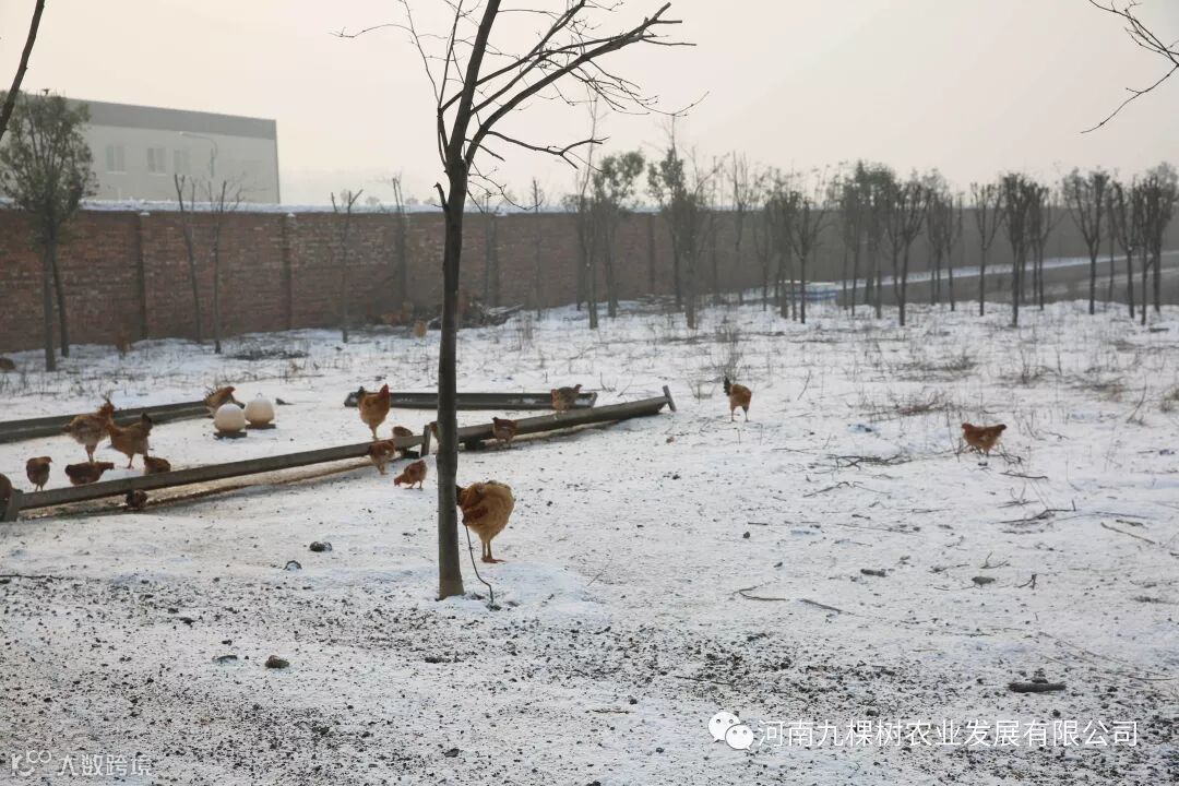 在九棵树养殖区内,成群的小鸡在雪地上追逐、觅食,留下一串串足迹,像雪地盛开的一朵朵小花。再往前走,会看到鱼塘里游泳的鸭子,那么悠然自得,无拘无束。