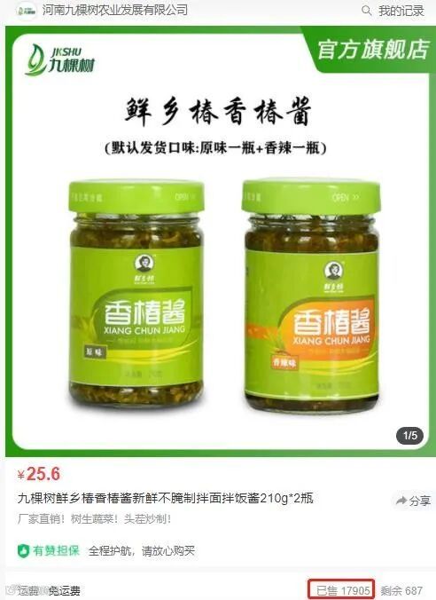 直播当晚,不到两分钟的时间卖出35254瓶,拌着鲜乡椿,主播吃了一大盘米饭,要知道,香椿酱即使配着白米饭也是非常美味的。