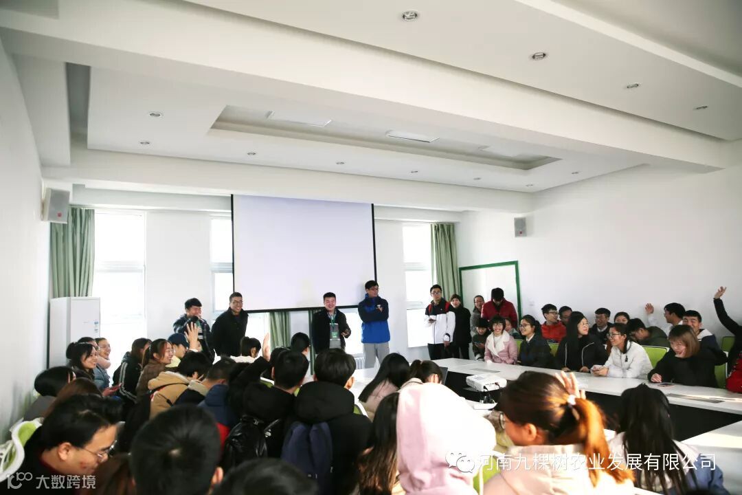 于总邀请广大师生来到九棵树会议室,观看了九棵树宣传片,于总又向大家介绍了香椿的传统文化、九棵树起名缘由以及九棵树企业文化。