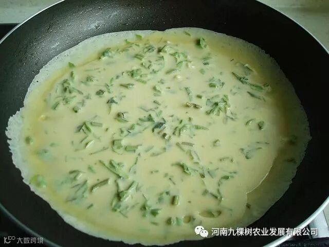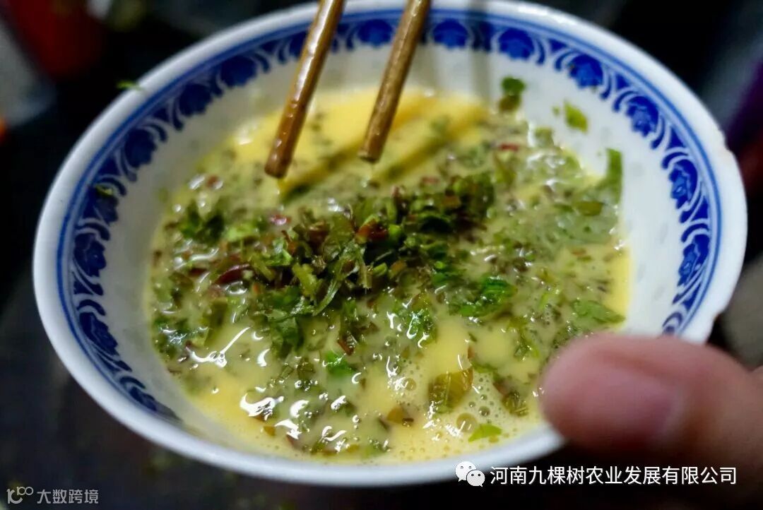 将面粉,香椿嫩芽切碎或者直接用九棵树香椿酱倒入鸡蛋液中,放入少许盐、拌匀,备用;