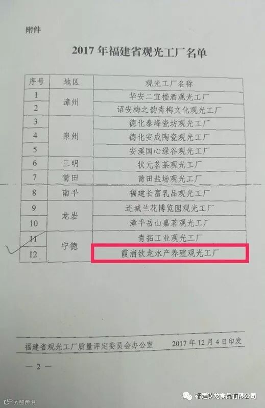 近日,福建省旅游发展委员会公示了12家2017年福建省观光工厂名单,霞浦县钦龙水产养殖观光工厂榜上有名。