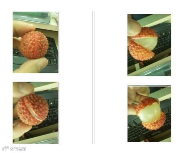 荔枝中间有一条缝,只要沿着缝轻轻一捏,荔枝皮就会裂开,露出果肉。