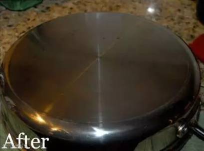方法:这里需要用到小苏打。将小苏打均匀倒在锅底,添上一点水淋湿,等两个小时后用钢丝球刷洗,就能收获亮洁的锅啦。