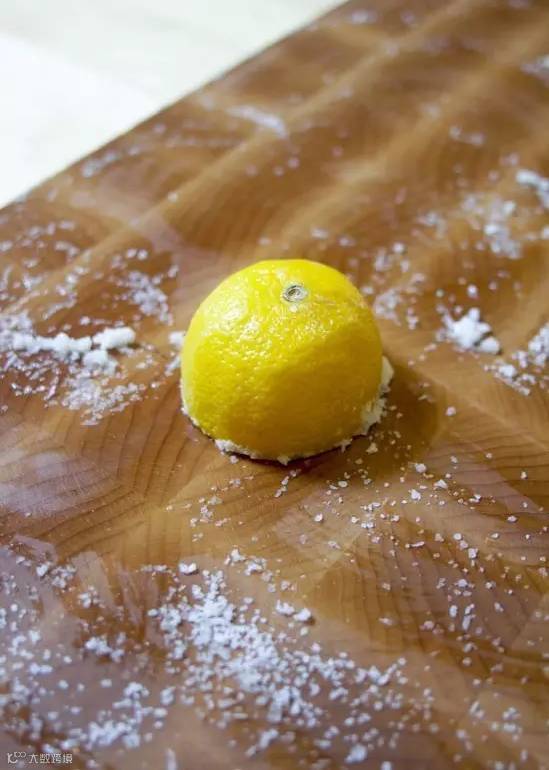 方法:半块柠檬加一些盐粒就可以还你一个干净的砧板。用柠檬按压盐粒不停摩擦,直到全部擦拭一遍,再用清水冲洗干净即可。