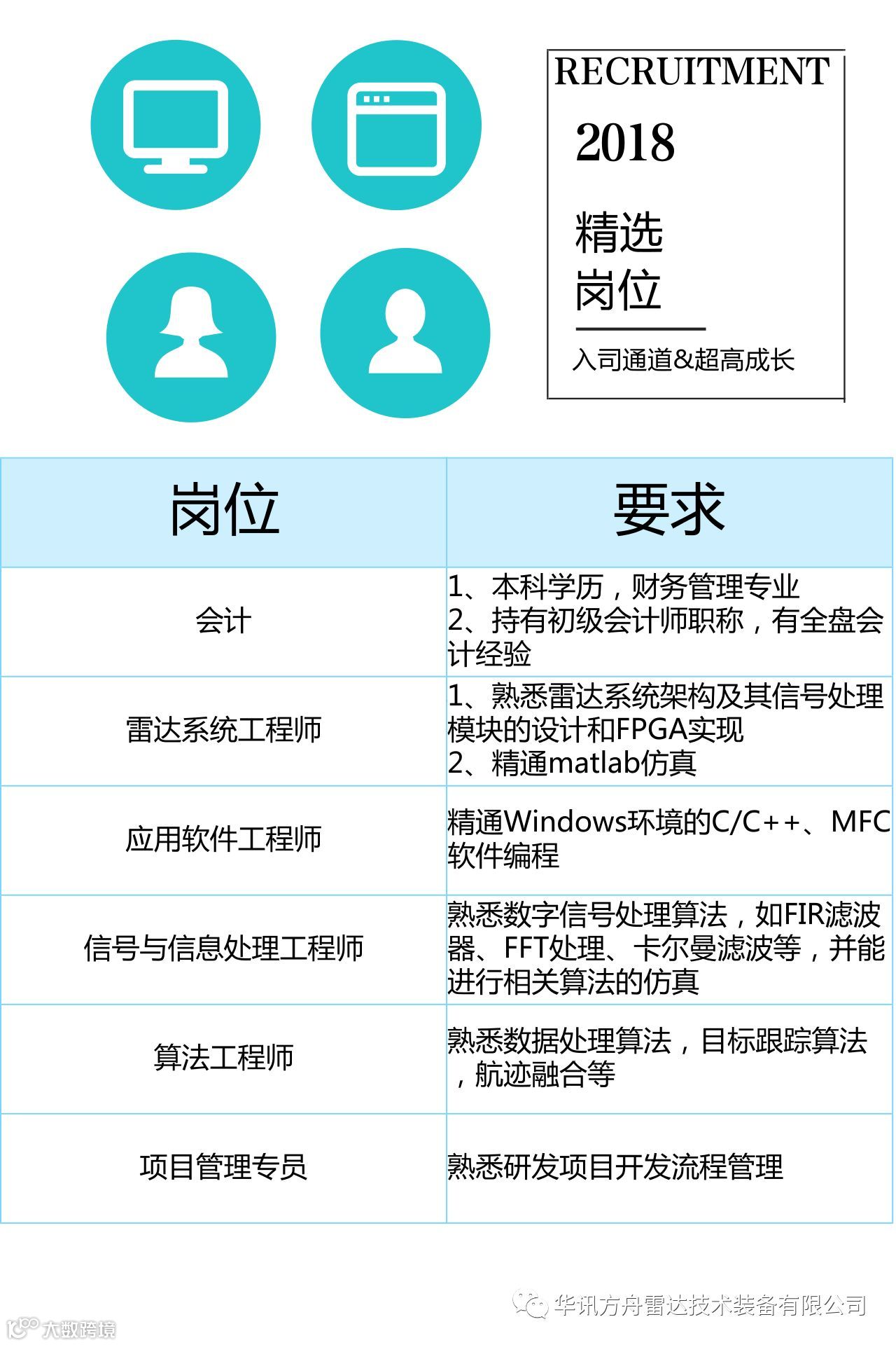 华讯方舟雷达技术装备有限公司2018年,随着公司业务扩大,我们邀请更多小伙伴加入我们,只要你满足以下要求,赶紧联系我们吧!