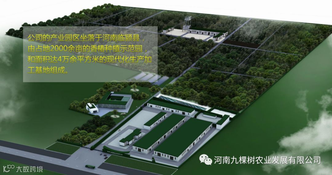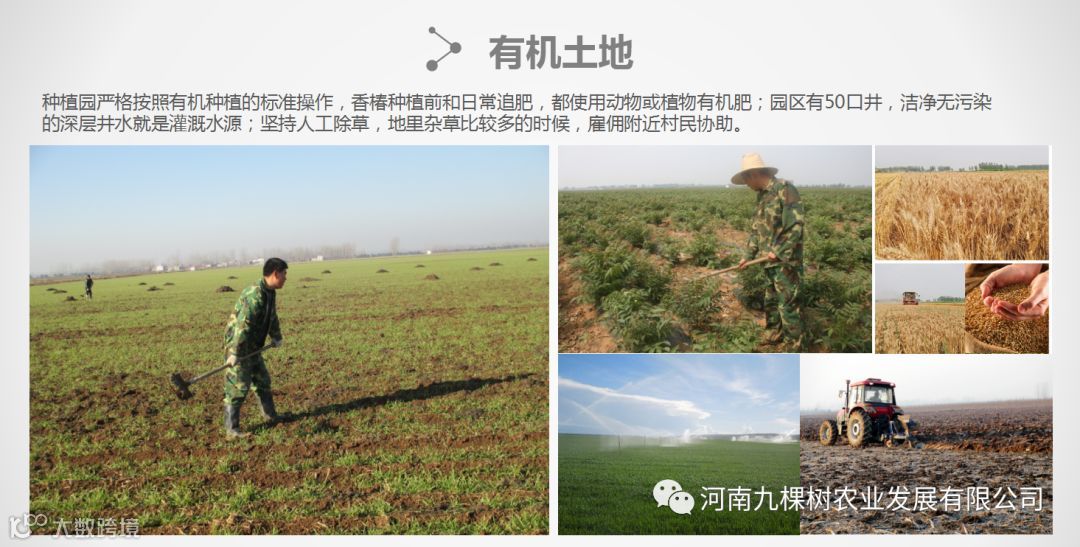 河南九棵树农业发展有限公司,是2016年新成立的新型现代农业发展集团,注册资本6000万元,已开发有机香椿和有机小麦种植基地2000余亩,2015年获得国家有关部门有机食品认证并有国家有机食品认证部门颁发的《有机转换认证证书》(证书编号:028OP1500060)。现代化的厂区面积达40000多平方米,生产车间、办公设施、科研机构和场所、职工公寓等现代化生产生活设施一应俱全。是目前国内一家规模大、功能全、技术先进的有机香椿现代生产企业,也是集有机香椿及有机农产品种植、研发、深加工、销售为一体的现代农业产业化龙头企业。