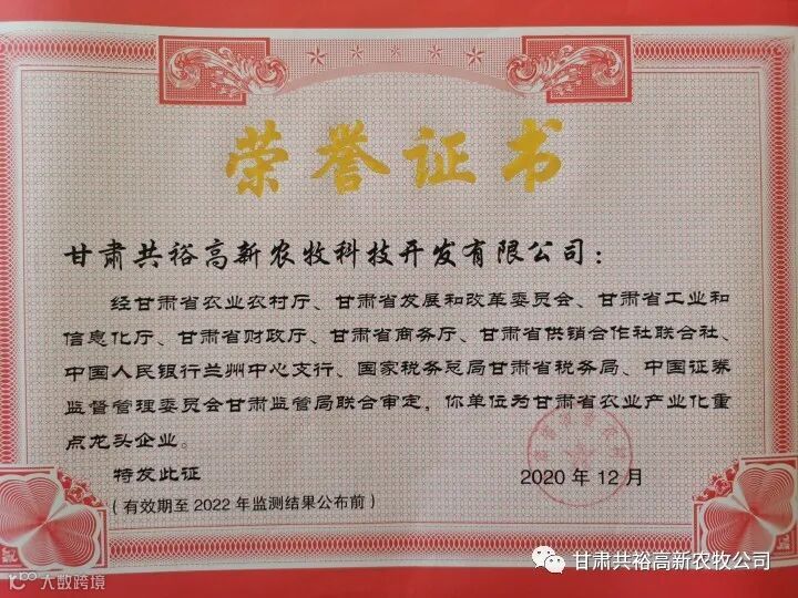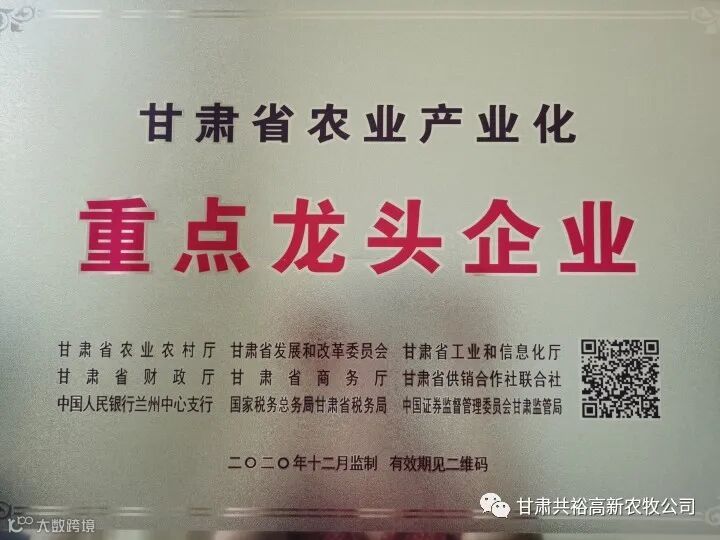 甘肃共裕高新农牧公司根据甘农产发(2020)9号文件《关于公布甘肃省第十二批农业产业化重点龙头企业名单的通知》,我公司荣获甘肃省农业产业化重点龙头企业。